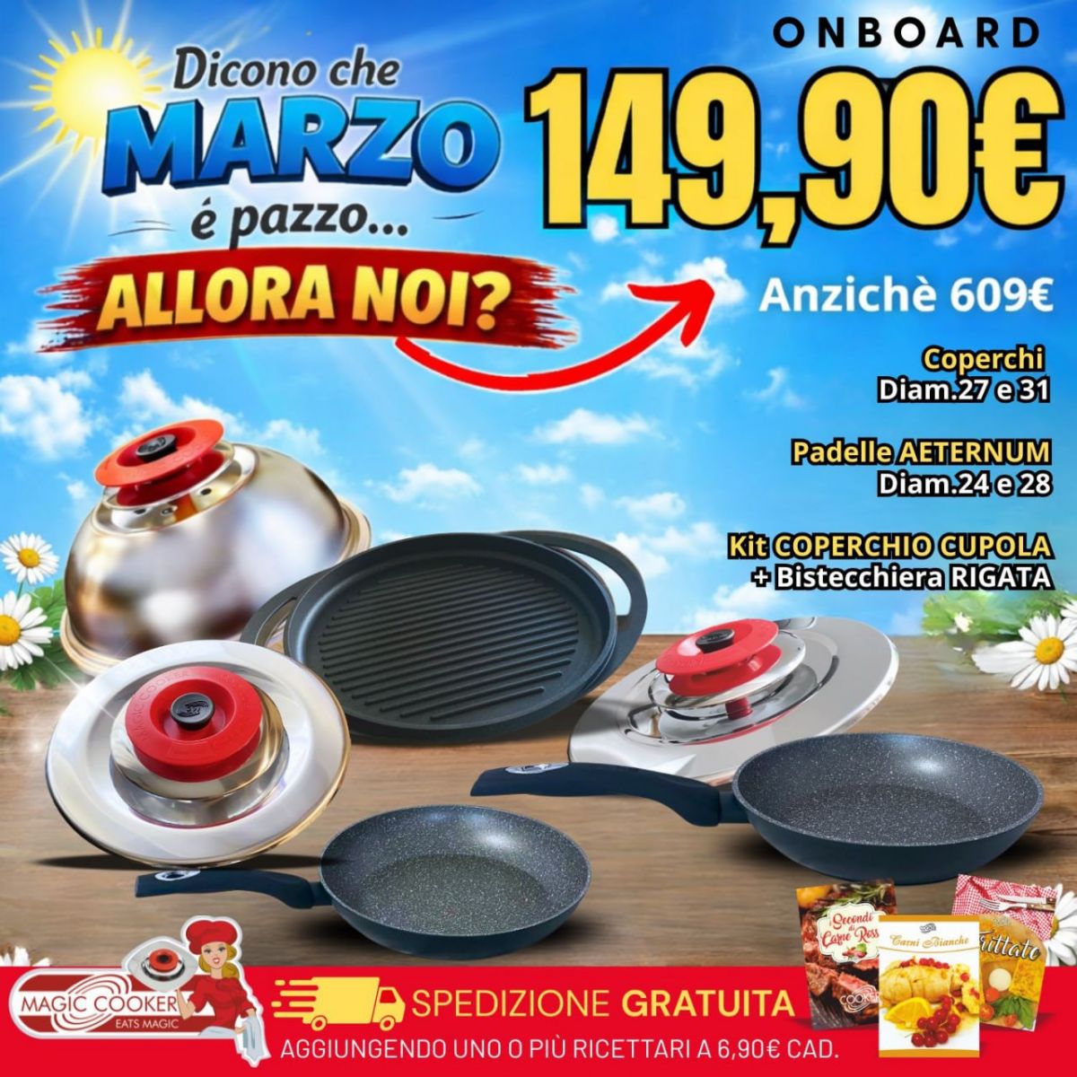 KIT ON BOARD MAGIC COOKER & AETERNUM: ART TONDO 27 - 31 CLASSIC + PADELLE AETERNUM DIAM. 24 - 28 CM + ART CUPOLA SANPIETRO CLASSIC + GRILL RIGATA 42x34 2 MANICI